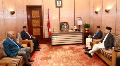 काठमाडौँ । प्रधानमन्त्री पुष्पकमल दाहाल ‘प्रचण्ड’ले सदनमा देखिएको गतिरोध हटाउन सभामुख र शीर्ष नेतासँग छलफल गरेका छन्। उनको आह्वानमा प्रधानमन्त्री निवास बालुवाटारमा तीन दलका शीर्ष नेताको छलफल जारी छ। बैठकमा प्रधानमन्त्री दाहाल, सभामुख देवराज घिमिरे, पूर्वप्रधानमन्त्री एवं नेपाली कांग्रेसका सभापति शेरबहादुर देउवा, पूर्वप्रधानमन्त्री एवं नेकपा (एमाले) का अध्यक्ष केपी शर्मा ओलीसहित तीन दलका प्रमुख सचेतक…