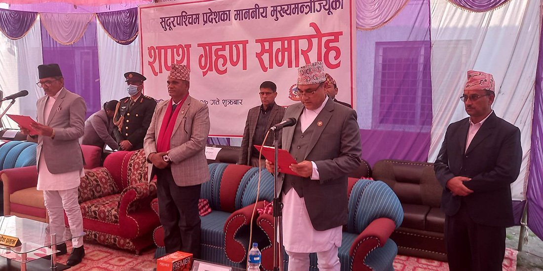 काठमाडौँ । सुदूरपश्चिम प्रदेशका नवनियुक्त मुख्यमन्त्री कमलबहादुर शाहले पद तथा गोपनीयताको शपथ लिएका छन् । प्रदेश प्रमुखको कार्यालयमा आयोजना गरिएको विशेष समारोहकाबीच शाहले प्रदेश प्रमुख देवराज जोशीबाट पद तथा गोपनियताको शपथ लिएका हुन् । संविधानको धारा १६८ को उपधारा ३ अनुसार ठूलो दलको हैसियतमा हिजो मुख्यमन्त्रीमा नियुक्त भएका थिए । गत २७ पुसमा नेकपा एमाले,…