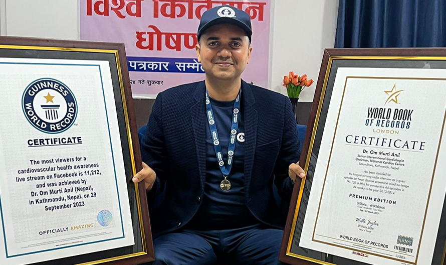 काठमाडौँ । मुटुरोग विशेषज्ञ डाक्टर ओममूर्ति अनिलले विश्व रेकर्ड कायम गरेका छन्। चिकित्सक एवं लेखक उनले विश्व मुटु दिवसका अवसरमा गत असोज १२ गते आफ्नो फेसबुक पेजबाट मुटुरोगको रोकथामसम्बन्धी जनचेतनामूलक प्रत्यक्ष प्रसारणबाट विश्व रेकर्ड कायम गरेका हुन्। आज यहाँ आयोजित पत्रकार सम्मेलनमार्फत फेसबुकमार्फत प्रत्यक्ष प्रसारणमा ‘कार्डियोभास्कुलर स्वास्थ्य सचेतनाका लागि सबैभन्दा बढी दर्शक’ भन्ने शीर्षकमा गिनिज…