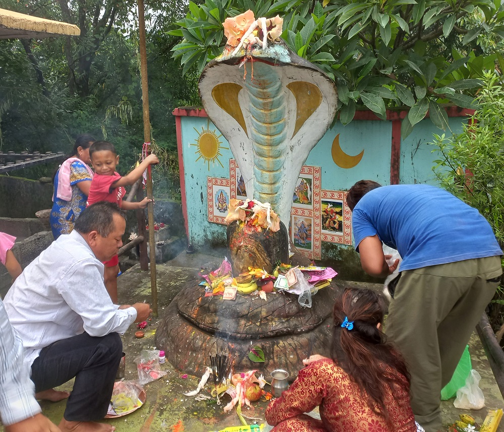 काठमाडौँ । नागपञ्चमी पर्व आज परम्पराअनुसार नागको पूजाअर्चना गरी घरका मूलढोकामा नागको प्रतिमा टाँसेर मनाइएका छ। नागपञ्चमीको दिन दैलोमा गाईको गोबर, दुबोसहित नागको चित्र टाँस्नाले वर्षभरि नागले रक्षा गर्ने धार्मिक जनविश्वास छ। नागपञ्चमीको अवसरमा काठमाडौंको नागपोखरीमा सोमबार बिहानैदेखि भक्तजनको भीड लागेको छ।
